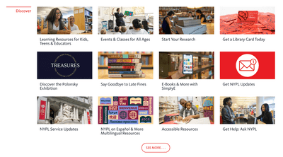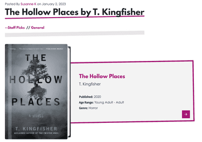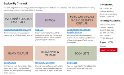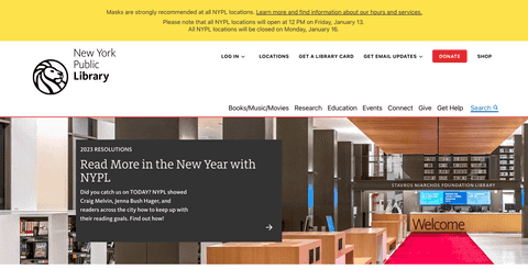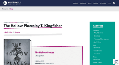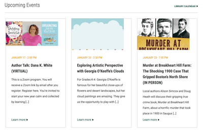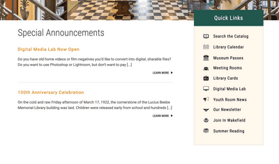 - Book lists (e.g. "New Arrivals") use imagery from, and link directly to, a NOBLE catalog entry. Hopefully website admins can assemble these lists natively in the CMS via integration with NOBLE catalog. Allowing patrons to quickly access the actual catalog entry is good, but it would also be nice to have the option to elaborate on what makes each book noteworthy (themed per website aesthetic) before sending users to the catalog.